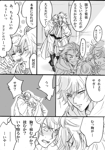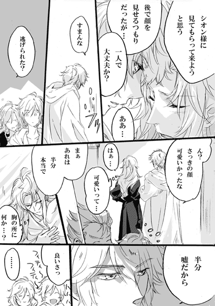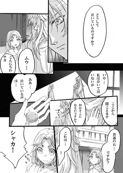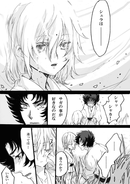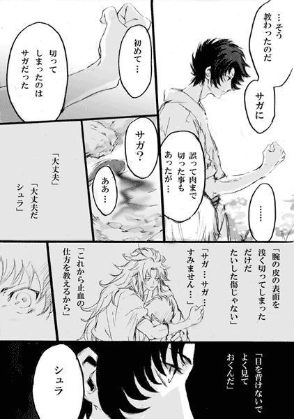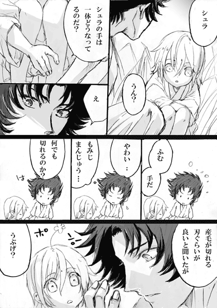 「いつまで続くの?」と聞かれたけど「さぁ…?」何も考えてないです。とりあえず「産毛が切れる刃が~」というのを描きたかっただけでしたが、つらつら続きました。これはお正月にね、刃物扱ってる職人さんがインタビューで答えてたので、シュラに使えるかなぁ…って。だいぶ期間経ってしまいましたが。後、初めて切った人がサガだったらと個人的に萌えてました。「だからサガには逆らえない」とか言わせたかったけど、言わないな…。シュラの場合そういうの考えなさそうだなとか思って…無意識に逆らえない何かがサガには色々有ると良いなーー。でもこれ、「エクスカリバー!」を描いたあたりで、だいぶ気が済んでいた(笑)ので、思ったより続きを描いてて自分でも、よく分からない~とか思ったけど、結局皆好きなんだなぁ…。